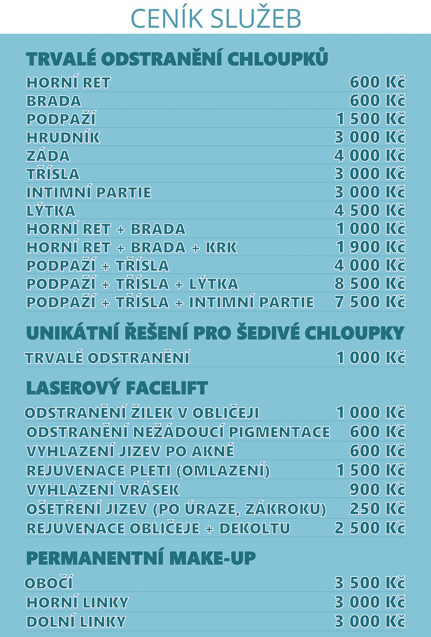 Ceny jsou v následujícím CENÍKU pouze orientační. Výsledná cena je vždy dohodnuta až po posouzení rozsahu příslušného zákroku.